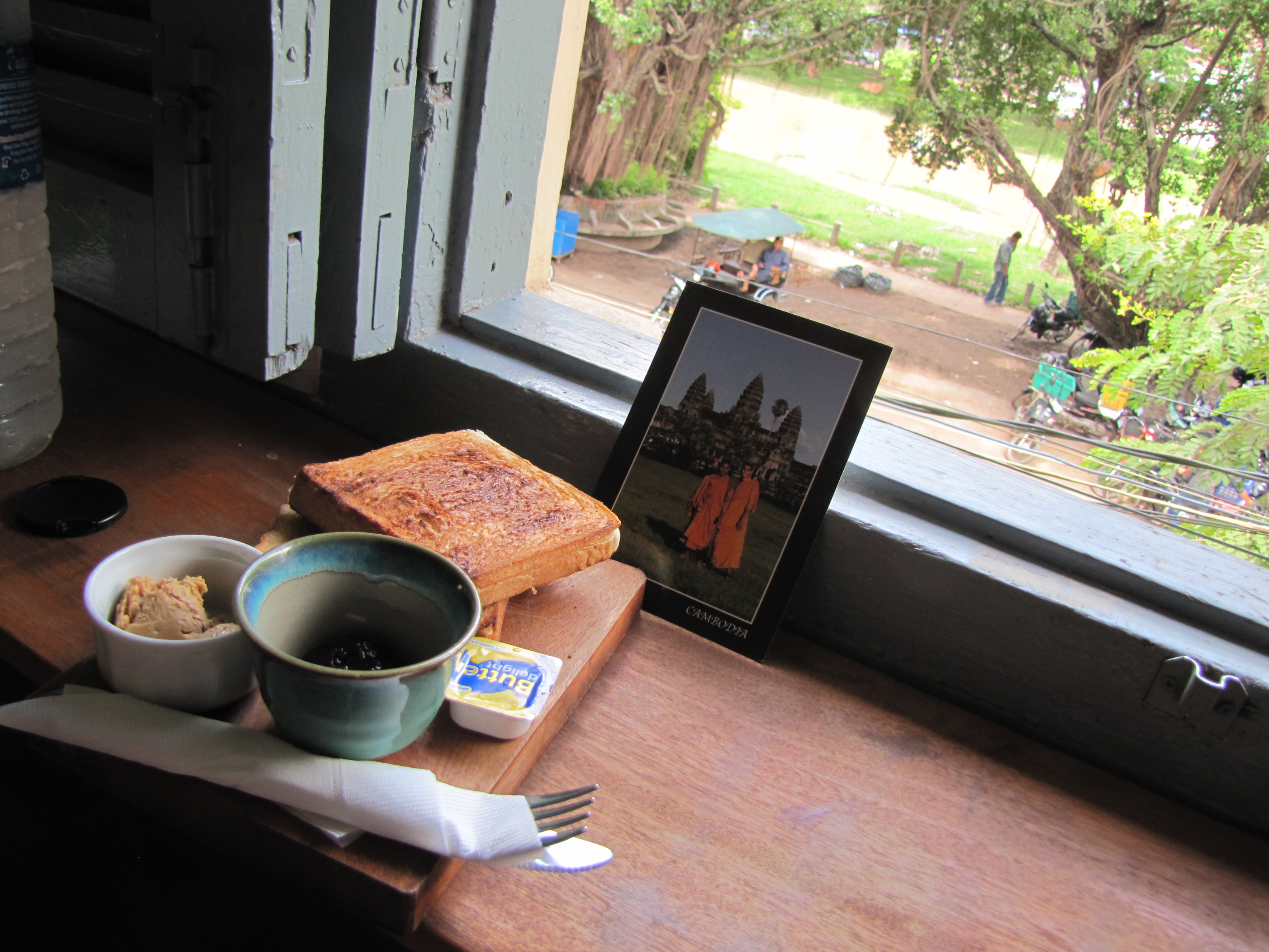 IMG_1663I first saw this quote handwritten on a place mat in Siem Reap, Cambodia. This place mat, colorful and inviting, lured me to a table in the second-floor reading nook of Sister Srey Cafe. Outside an adjacent window, the mid-morning sun was reaching its bright golden fingers through the foliage shading Siem Reap River. Thus perched, I sat staring at two thick slices of toast, my mind slowly emerging from food-poisoning-induced delirium.