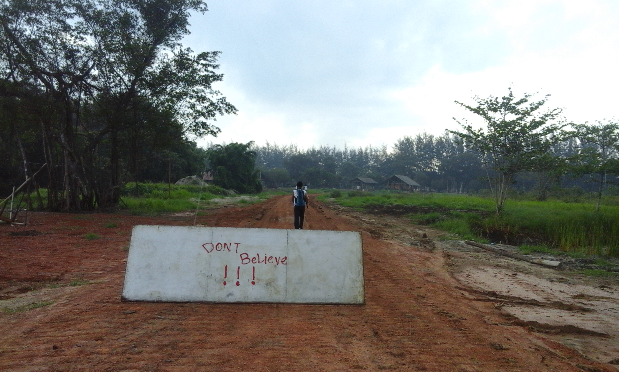 "Don't Believe" apparently means "Don't Enter." We started running this way but then walkie talkie guy called us back and directed us down a small dirt path overgrown with grass. Let the games begin!