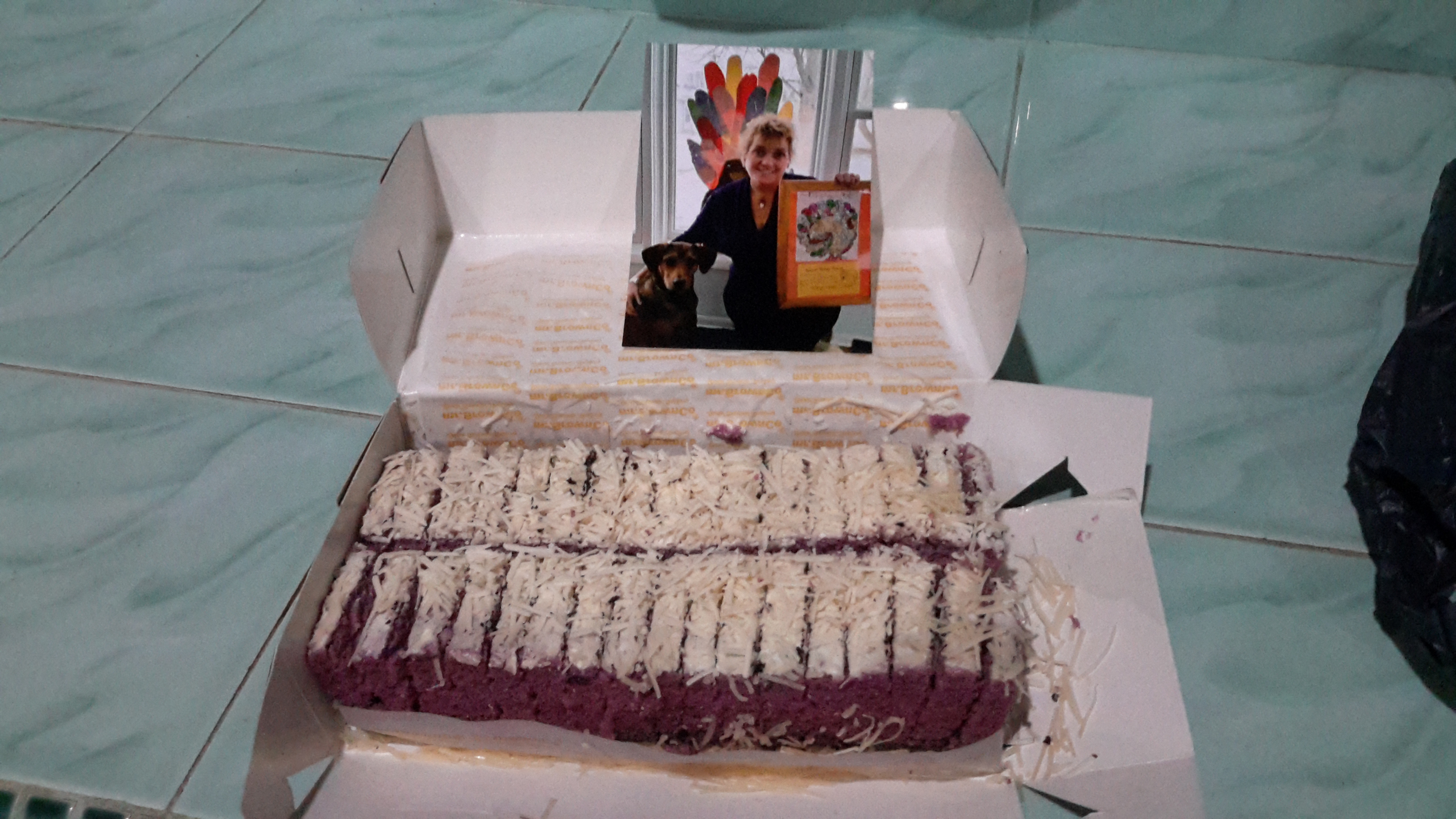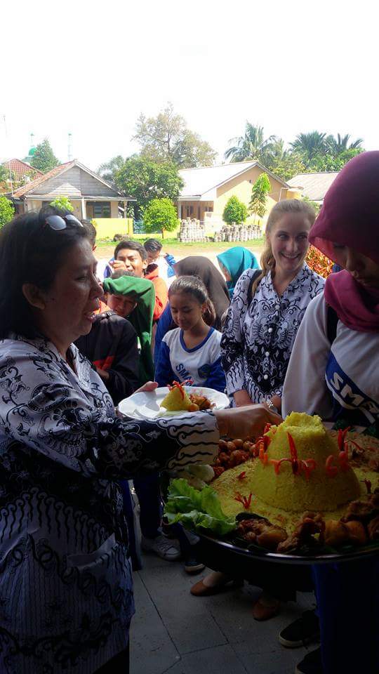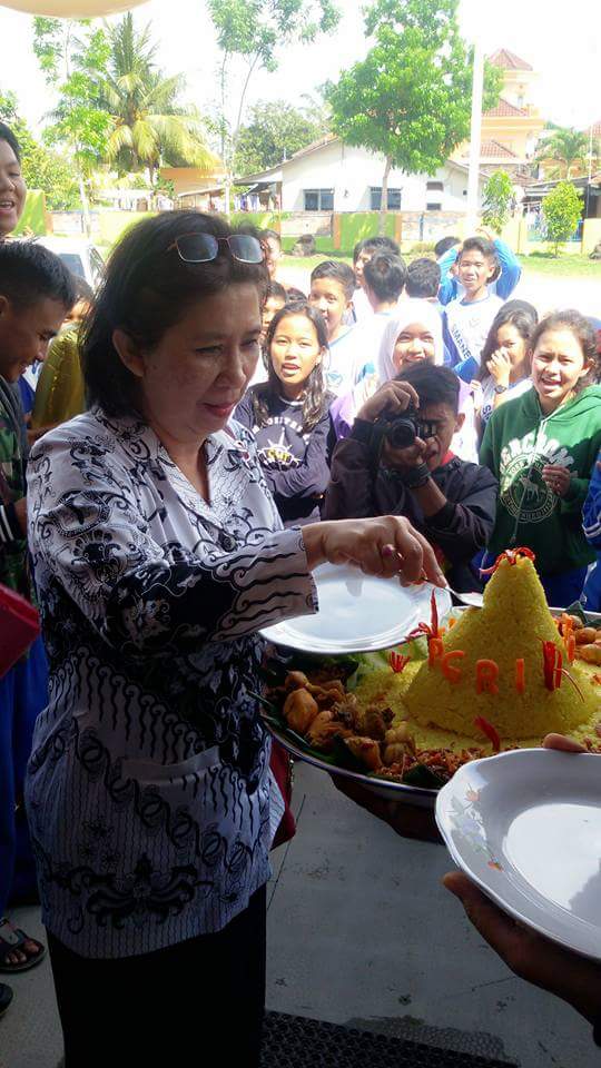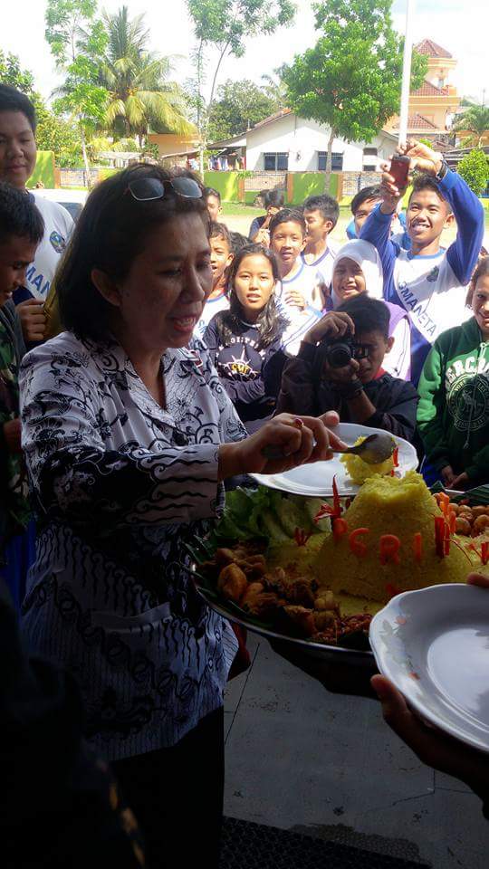 Not for the first time I was struck by a surge of love for my students. Balloons are an apt analogy; I felt those warm-fuzzy-feelings ballooning up in my chest. Their smiling faces and cheerful clapping needed no translation. From inside the main building, another student appeared carrying a large tray piled high with yellow rice. Something to the effect of Selamat Hari Guru ke-70 [Happy 70th Teachers’ Day] was carved out of carrots and arranged along the top. The singing continued as Ibu Kun, the headmistress and person of highest ranking present, was given the honor of removing the crown of the rice pile and taking the first bite.
