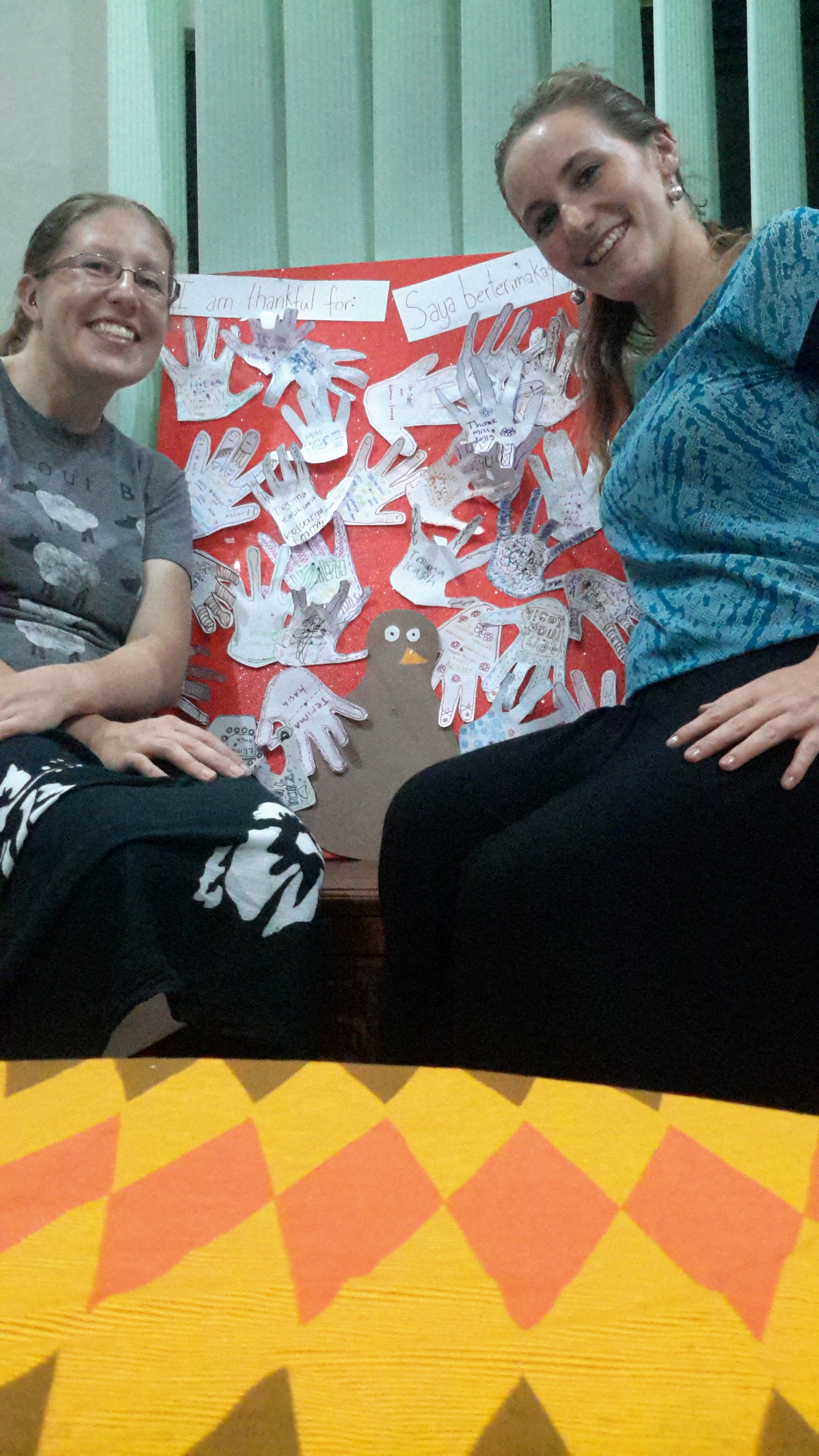 Me and Caitlin after English club with the “I am thankful for…” turkey made out of the hands of our kids. This decoration (along with the Halloween tinsel that is still on the front door) will probably stay up until we leave.