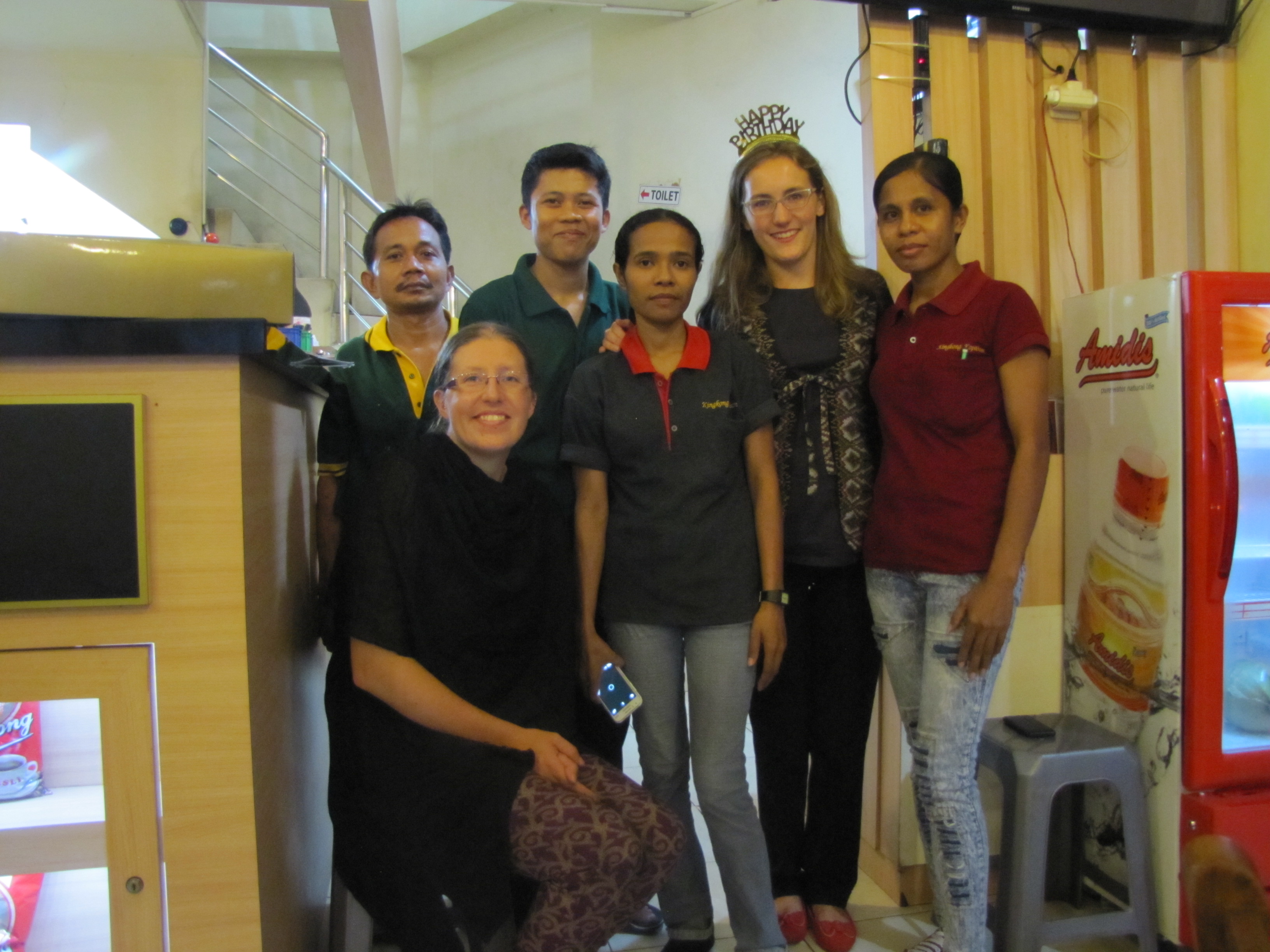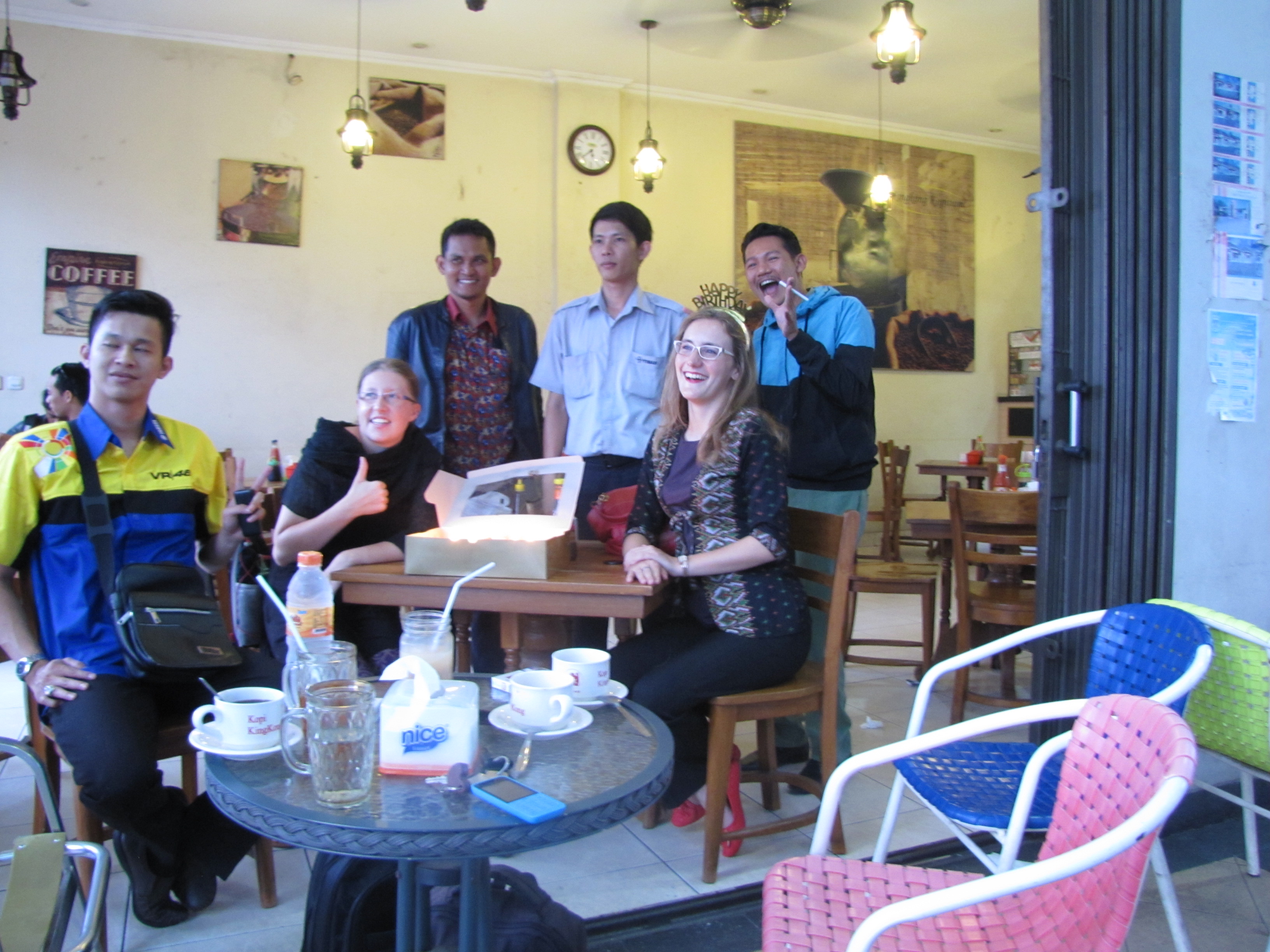 Last but not least for this post, a major highlight from the last few weeks was definitely having Alicia in town. She came to help us with our workshop (see above, section 2) but we also tried to make her visit in PKP worthwhile. Pak Elvan came with us to pick her up at the airport and he took us to the restaurant that he took us to when Caitlin and I first arrived. Friday evening we were up until the wee hours of the morning, talking and eating martabak and putting together the final pieces of our presentations for the following day. Saturday’s workshop was fun, and afterward I took her to meet some professors from UBB (Universitas Bangka-Belitung) to discuss English classes and curriculums at a local coffeehouse. Later that evening, we had dinner with Manggo at D’Barleys (the only place we know of to get passable Western food) and went to D’Grande to listen to live music and get dessert.