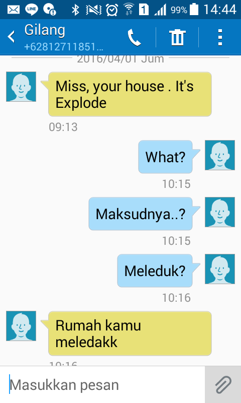 But this doesn’t mean my April Fool’s Day was uneventful. Quite the opposite: I had an incredibly stressful ten minutes when I was convinced that my house had exploded. It sounds like a far-fetched prank, but I believed it 100% because I’ve heard of gas tanks exploding and assumed that is what happened. This prank came courtesy of my friend, student, and son of my counterpart Bu Asro: Gilang. Check out the screenshots below for a blow-by-blow as this drama unfolded.