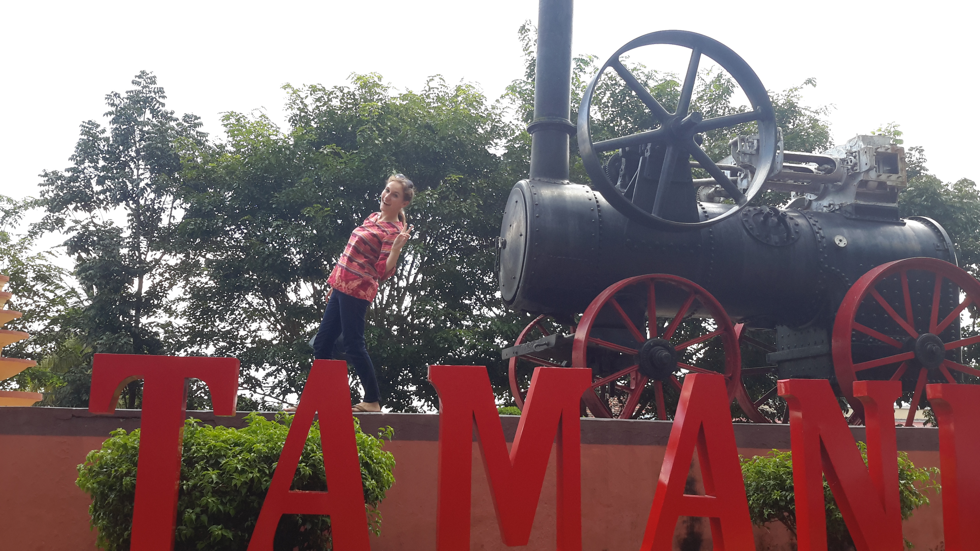 Once upon a time there was a train on Bangka, presumably to cart aforementioned tin to the ports. This train stands as a relic. Its parts still move, hence my surprised smile.