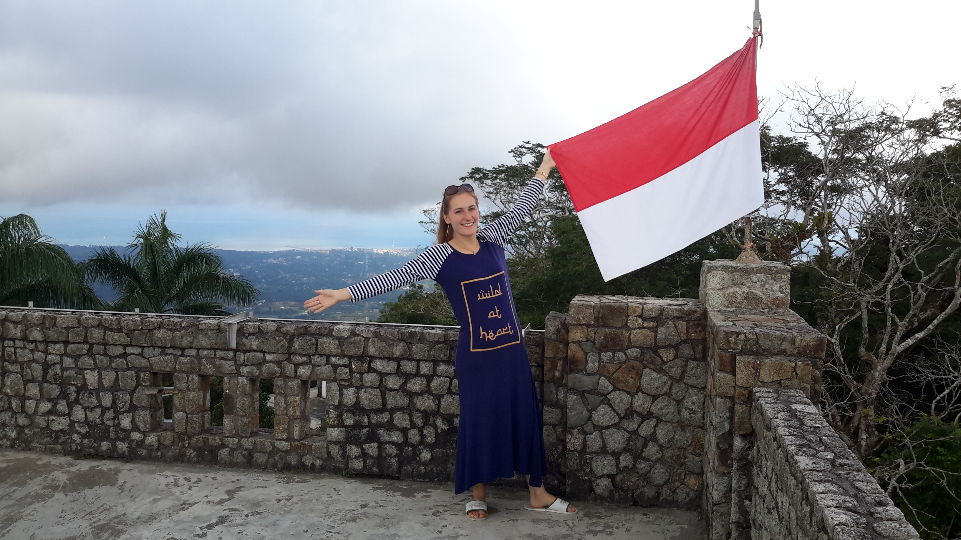 Another view, this time posing with the merah-putih (red and white, Indonesia's flag).