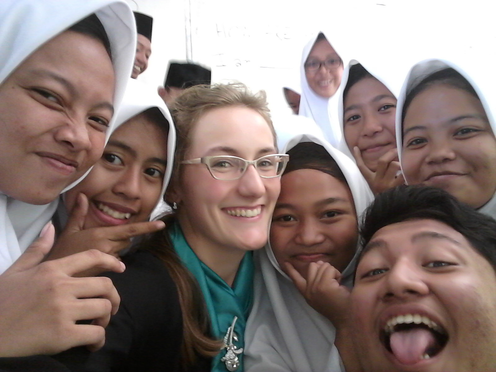 While the class is writing, I walk to the back of the room and sit down next to the girl in the far back corner. She leans away and looks at me with wide eyes. “Good morning!” I say to her with an encouraging smile. “G-g-g-good morning,” she stutters back. “What is your name?” “Putri,” she whispers. ” “How are you, Putri?” “I am fine,” she responds. I raise an eyebrow. Her friends listening in whisper furiously. She squints at the board and looks back at me. “I am happy,” she says with more confidence. “Good! Great to hear. Thanks Putri,” I smile at her and move on, repeating the conversation with each student…