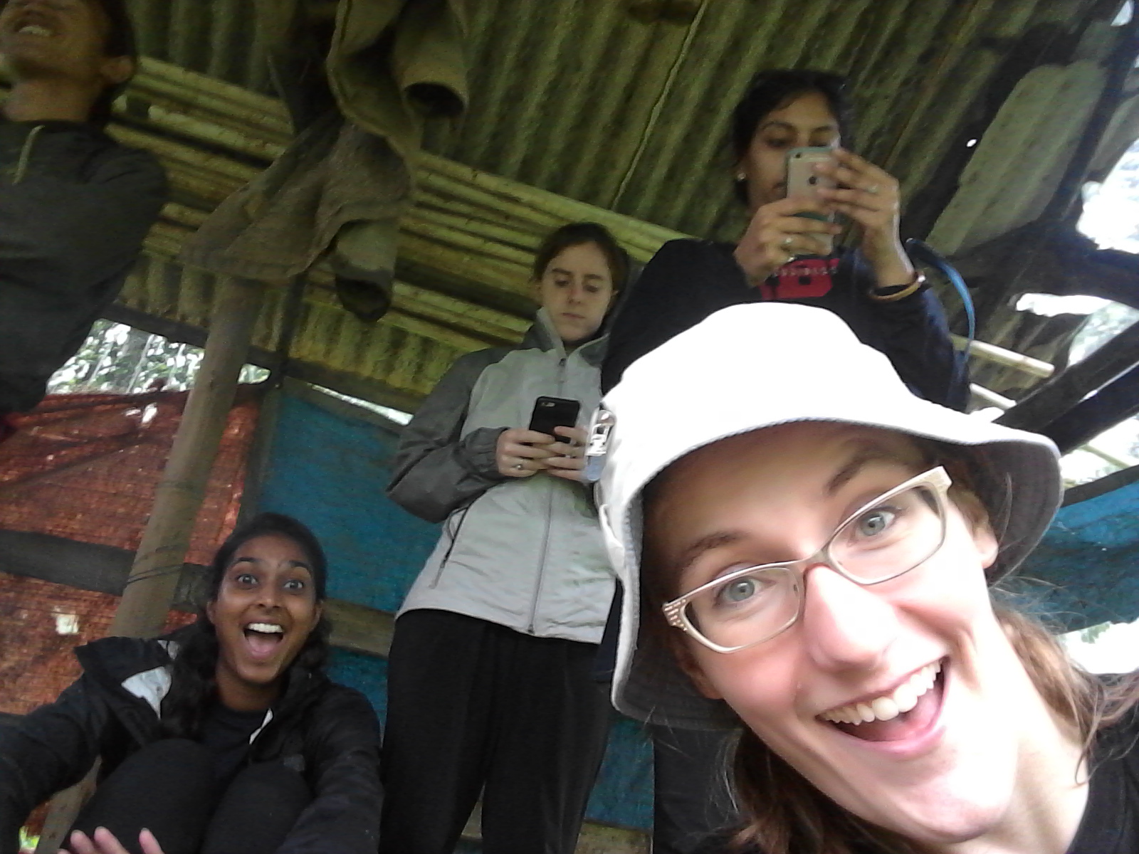 Back on the safety of the sturdy ground, we made our moves toward the waterfall as the mist turned to drizzle and the drizzle turned to rain. We got our group photo (which we all agree is pretty dorky) and told Yongki we were ready to make our way back to the village. We paused at the parking lot for a salak [snakeskin fruit] snack break before continuing on our wet journey. The rain had turned the previously treacherous paths into a mud soup, so our return trip was made on foot. Yongki was barefoot the entire trip, though Krupa also shed her shoes for part of this journey. When the rain became a downpour, we took cover under a pondok [farmer’s hut] where we found Fikri was already making a small fire. Despite the tropical heat you usually find on Java, cold rain in the mountains had chilled our bones and the fire was welcome. We waited for the downpour to subside while Fikri and Yongki chatted in local Javanese, laughing and smoking miraculously dry cigarettes. Us ETAs snacked again–this time on hard-boiled eggs.