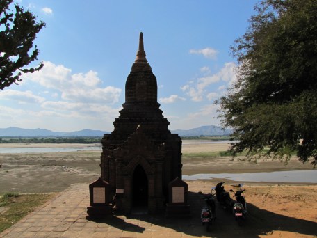 Any hopes of dipping our toes in for refreshment were out of the question, however, as the riverbank lay the length of a football field below us. It was the dry season, and the water had receded greatly. I imagine in the rainy season the entire basin fills, but for now, the river remained a distant reality. We parked next to a stupa and wandered around, taking photos while our artist-turned-guide shared more about local life. Curiosity satisfied, we returned to our bikes. It was then that Aungkolatt proposed another stop on our itinerary: were we perchance interested in seeing where he painted most of his pieces featuring temples growing out of the trees, the iconic image of Bagan? Of course we were interested!